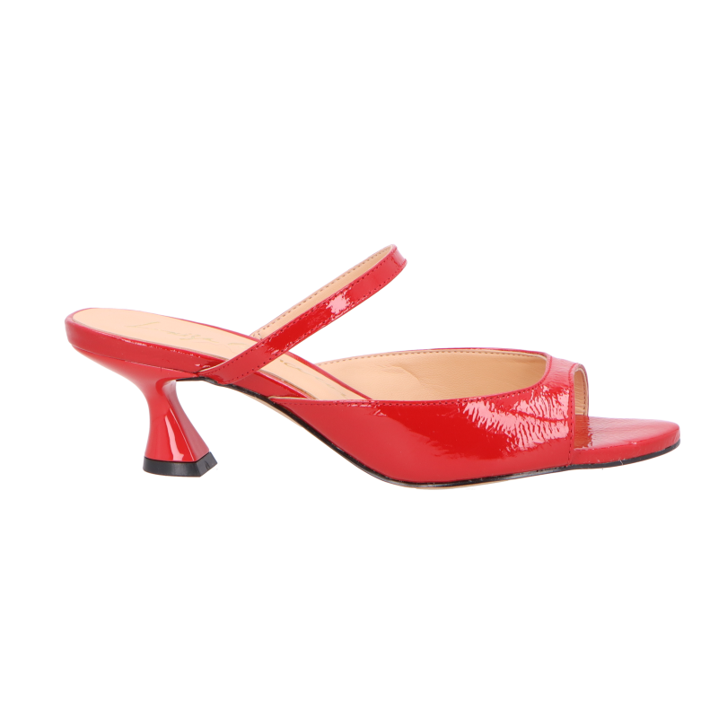 Com linhas que mesclam o minimalismo puro com a modernidade cool, essa mule é a peça-chave para um visual ultra elegante, seja com acabamento em verniz vermelho. O modelo com salto geométrico é versátil e prático, enquanto a tira fina envolvendo o tornozelo adiciona um toque de delicadeza feminina. Perfeita para diversas ocasiões, desde o dia a dia até eventos super sofisticados.